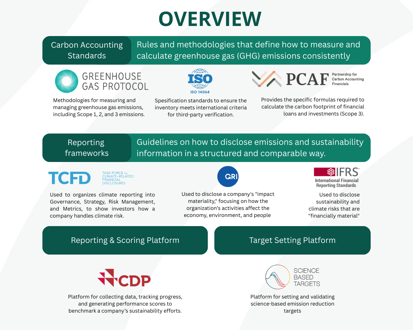 To support these practices, various emission reporting standards have been developed. However, the growing variety of standards can make it difficult for companies to determine which ones to use. Each standard serves a different purpose, from measuring greenhouse gas emissions to disclosing sustainability performance and climate-related risks.