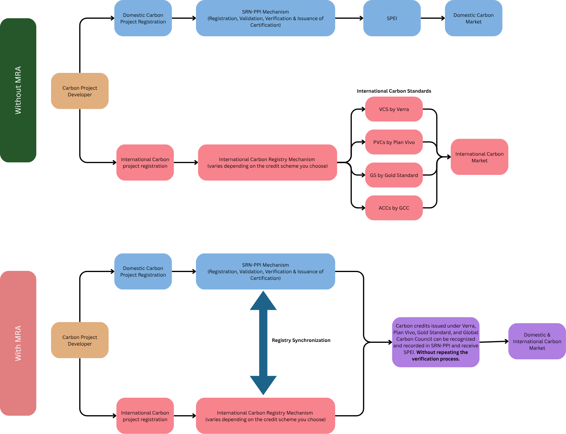 Once the MRA is implemented, carbon projects that have been verified under international standards can be recorded in the SRN-PPI without repeating the entire process through a cross-recording or registry reconciliation mechanism. Carbon credits from these projects, whether nature-based or technology-based, can be submitted for SPEI certification.